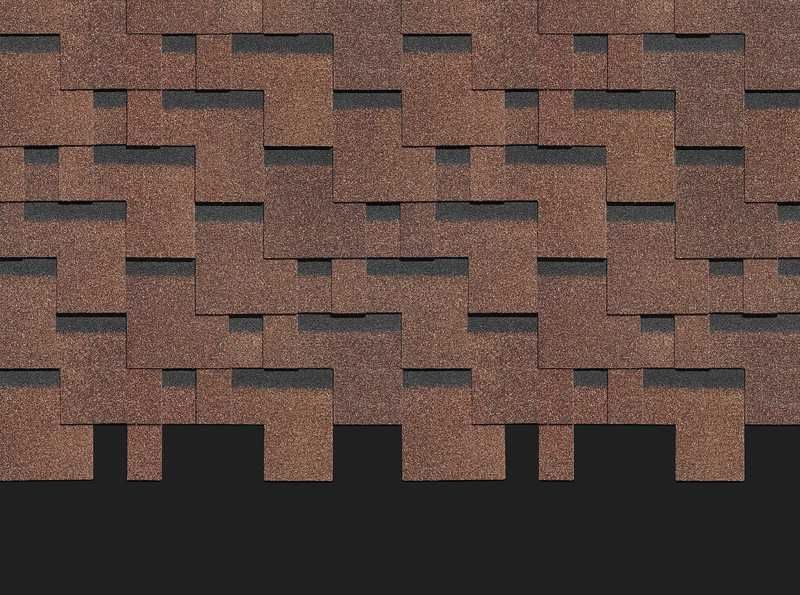 Нестандартную форму гонтов эффектно подчеркивают переходы ореховых оттенков и матовый блеск гранулята. Затемненные участки лепестков создают реалистичный эффект тени. Черепица хорошо смотрится с сайдингом нейтральных светлых оттенков и фасадными панелями под камень и кирпичную кладку.